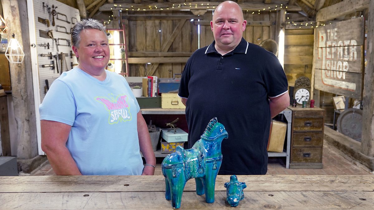 Lastly there’s a treat for expert Kirsten Ramsay when a piece of iconic Italian pottery arrives at the barn. The distinctive blue horse was produced by a company called Bitossi and, by sheer good fortune, it was won in a village fayre tombola by John Diamond and his sister Wendy in the 1970s. John and Wendy would often have fun days out as children with their much-missed mum and the winning of this horse - and Wendy being made to carry it for miles on the way home - is a memory they all shared. However, the horse has been in the wars and is currently decapitated! Kirsten must not only reunite the pieces, but colour match a multitude of shades of blue glaze if she is to help John and Wendy preserve the horse and memories of a lovely mum.