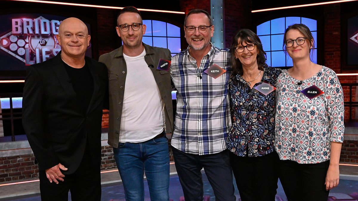 Ross Kemp presents the quiz show where a team of four take on the Bridge of Lies. In this episode, they are all members of the same family – Ellen, Keith, Anne and Martin.