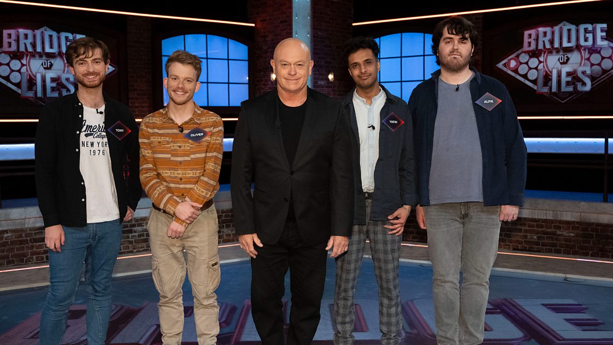 Ross Kemp presents the quiz show where a team of four – in this episode, friends Yafai, Tony, Oliver and Alfie – take on the Bridge of Lies.