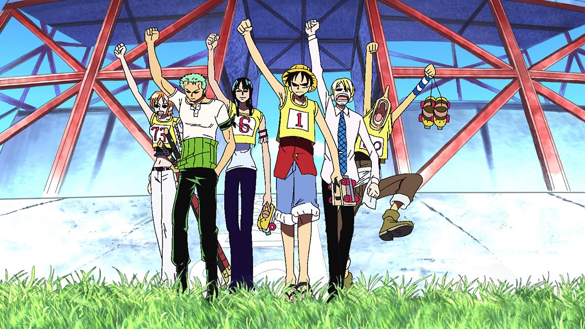 The third match of the Davy Back Fight is a five-round roller-skating game “Run Roller Round.” In each round, after the point getter of each team takes off, the defenders can either interfere with the opponent or assist their point getter. The winner is the point getter who’s ahead after five minutes. Luffy is the point getter in rounds one and five, Nami in two, Usopp in three, and Robin in four. But to everyone’s dismay, Luffy doesn’t know how to roller skate! Although Nami and Robin do their best to assist him, the Straw Hat team loses the first round. In the second round, Portier uses a hypnosis trick to put Nami and her teammates to sleep while her super slow teammate, Masshikaku, overtakes Nami. Foxy’s team has now won two rounds in a row and need only one more round to win the entire match. In Round Four, Usopp is up against Chikicheetah, a cheetah man. While Usopp pessimistically starts the race, Zolo teaches Luffy how to stand up on skates. Luffy finally gets it and renews his determination to win back Chopper.