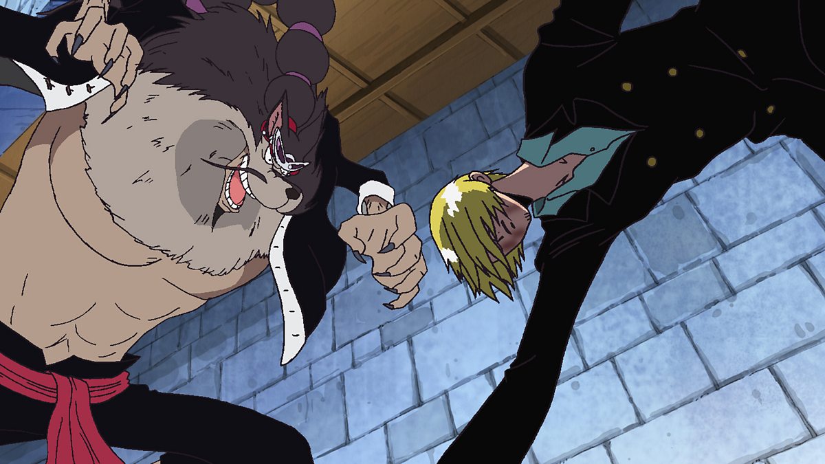 Sanji tells Nami and Sogeking to keep going while he battles Jabura for his key. The conniving Jabura tries to trick Sanji with an outrageous lie about Robin being his long-lost little sister, but Sanji of course doesn't fall for it. Sanji fights Jabura using a variety of attacks, and Jabura uses his Rokushiki powers to fight back. In the end, Sanji spins like a top and heats up his right leg, which he uses to give Jabura his coup de grace.