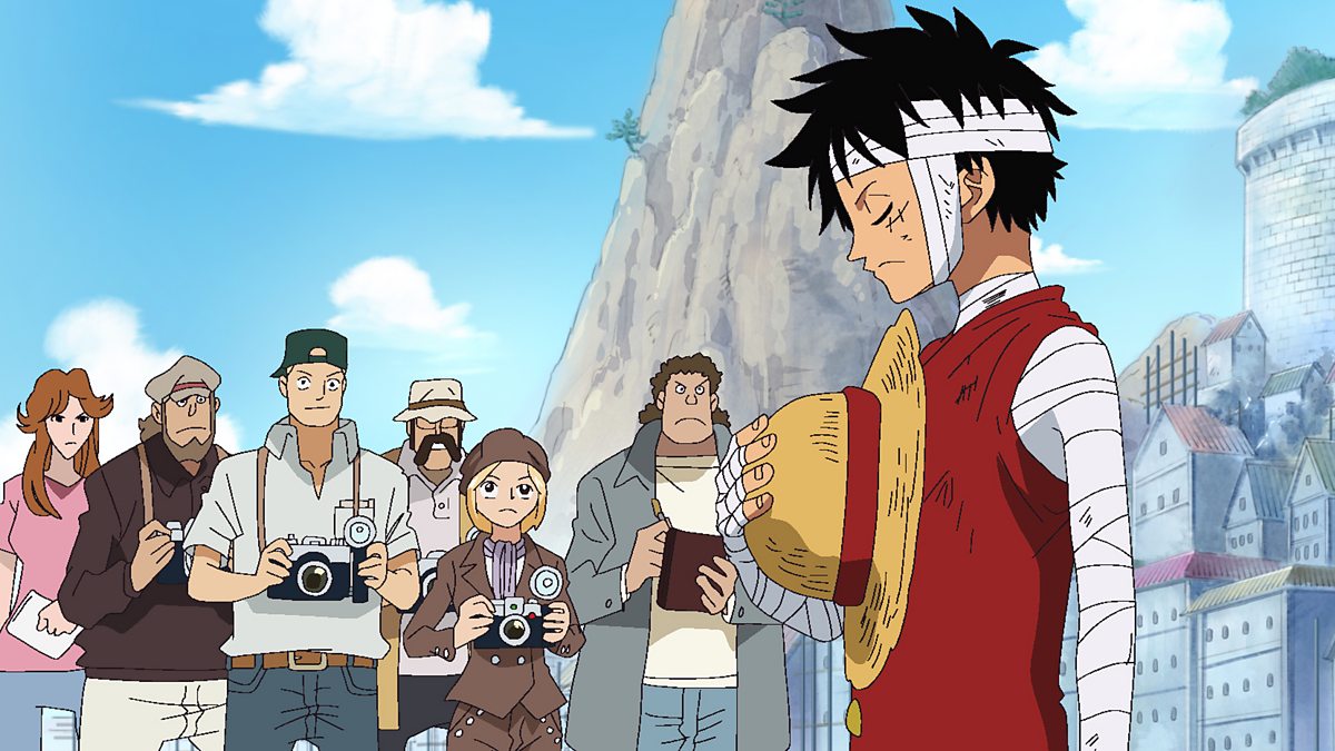 Luffy, Jinbe, and Rayleigh arrive in Marineford on a warship they hijacked. They circle the island once before land. Luffy heads to the Ox Bell in the plaza, rings it 16 times, and then observes a moment of silence by the crack made by Whitebeard. The Marines take it as a declaration of war, while Killer of the Kid Pirates interprets it the end of one era and the beginning of another. Meanwhile, Sengoku and Garp step down from their positions in the Marines; Coby learns he has obtained Haki; Aokiji and Smoker discuss Smoker’s request to be transferred to Base G5 in the New World; Bege’s ship gets pulled up to a big black object in the sky; and Urouge’s ship approaches an island that is constantly being hit by lightning.