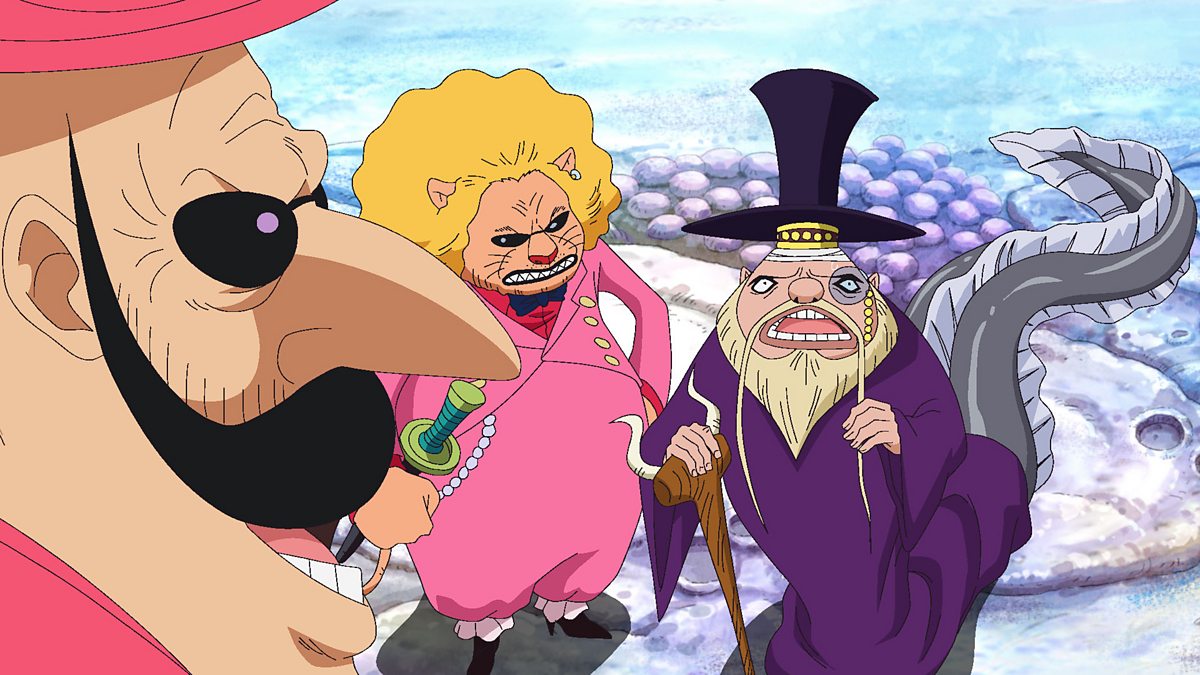 Luffy, Sanji, and Zoro easily find Caribou and the treasure, which Neptune promised to let them keep. On their way back, they run into Tamago and Pekoms in front of the candy factory. They are threatening the Minister of the Left and the citizens that Big Mam will destroy the kingdom if they don’t make their sweets payment for the month. Luffy, who ate all the sweets at the party, offers the treasure in their stead. Then, when Big Mam calls on the Transponder Snail, Luffy yells at her and says it’s crazy to destroy a nation over sweets. Big Mam is furious at first, but Tamago talks her into accepting the treasure. She develops an interest in the nervy Luffy and tells him to come to the New World. Luffy says he will blow her away and make Fish-Man Island his territory.