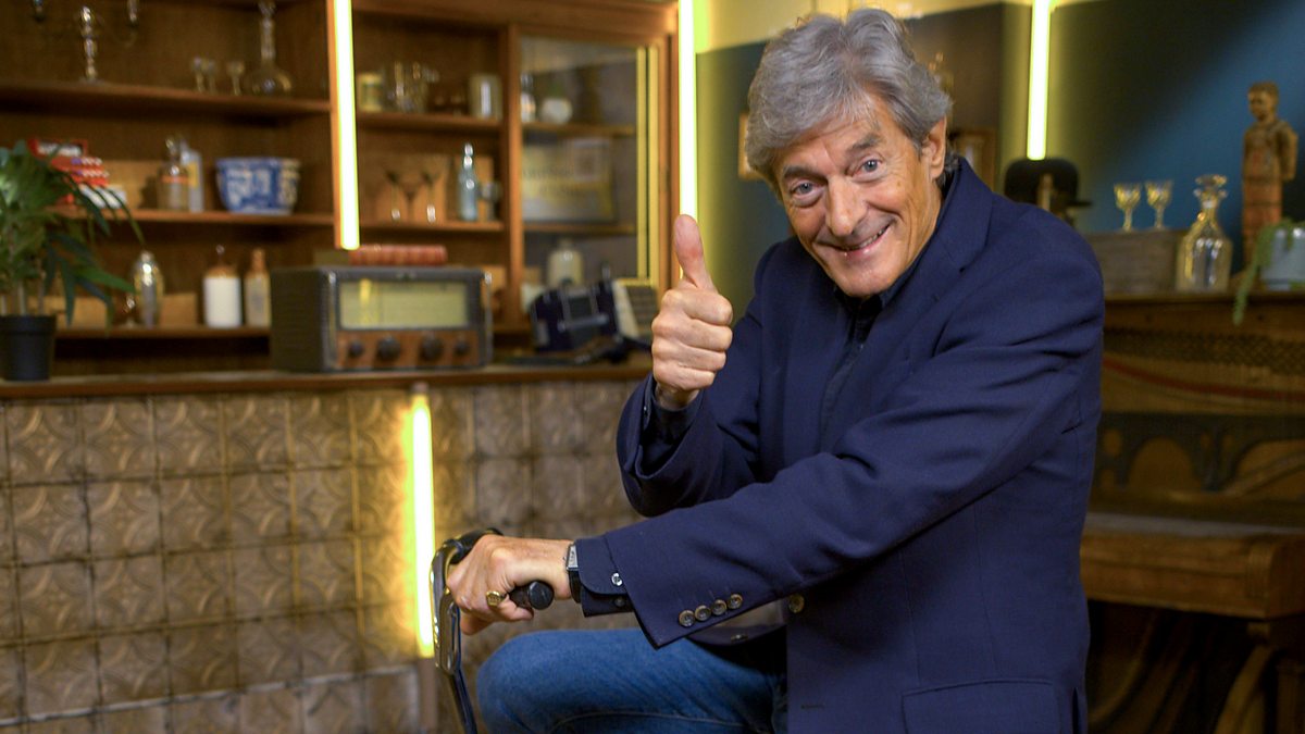 Nigel Havers presides as five sellers aim for the best price for their items, including an étagère, a German pendant light, some napkin clips, a spinning wheel and an exercise bike.