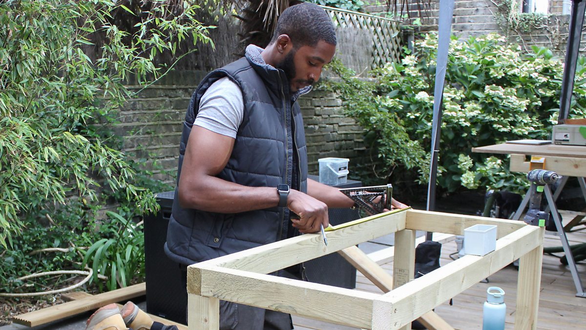 The team declutter and organise the flat, creating a fold-down kitchen worktop, a stylish bar area and a double office in the basement. With clever design and heart, they transform the flat into a functional and welcoming home.