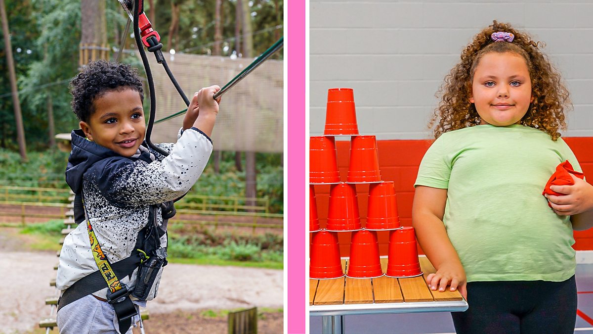Zac takes on a tree trail challenge with help from coach Kemari, while Bethan practises knocking over cups in tin can alley.