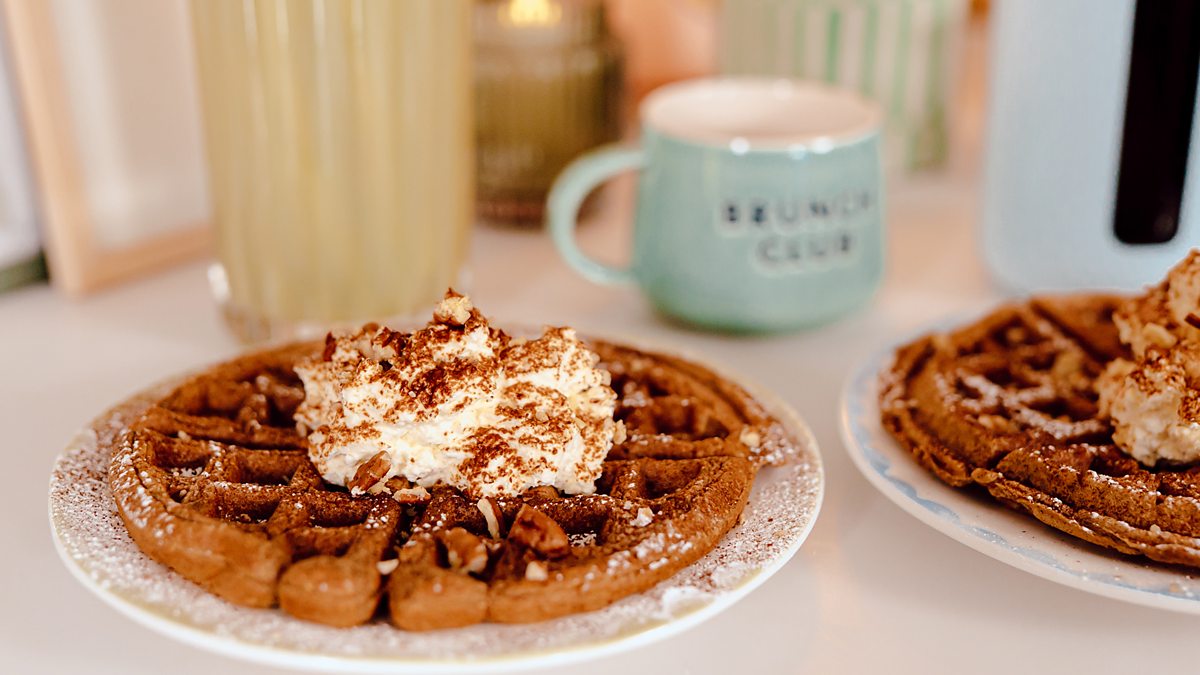 Waffles - tha iad a’ còrdadh ris a’ mhòr-chuid de dhaoine. Tha Abigail gan dèanamh i fhèin agus gan sgeadachadh gu brèagha. Brunch gu math blasta a dh’fhàgas gu math làn thu.