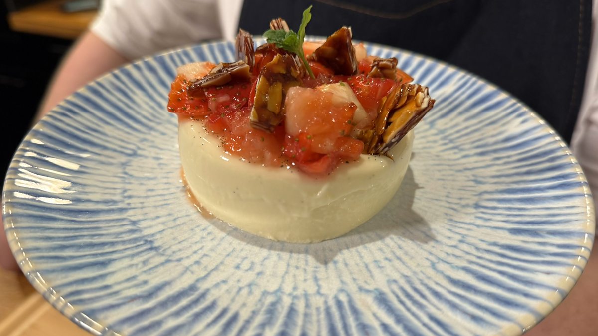 Earlier in the year, Gregor picked elderflowers in the village and made his own cordial. He uses this to flavour creamy panna cottas topped with a crunchy almond praline and crushed strawberries.