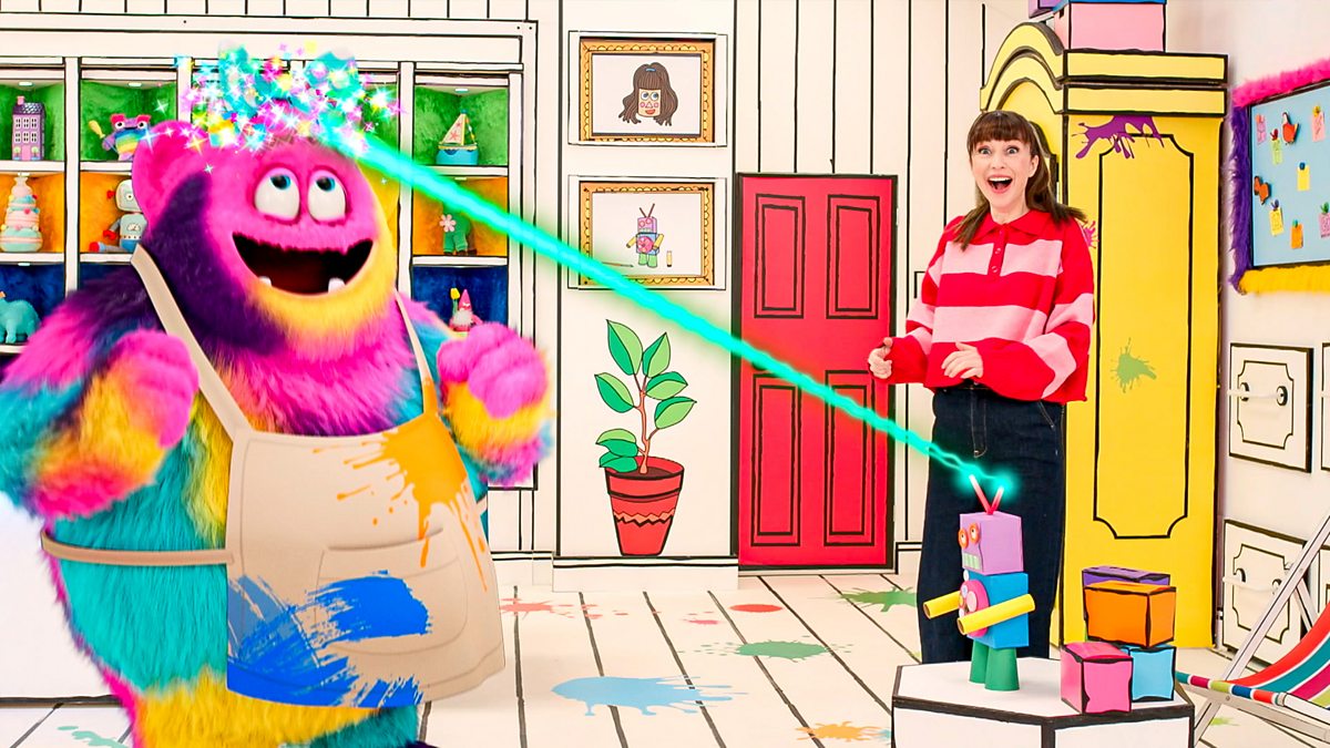 It’s recycling day in the attic – and it's also Murphi’s hairdo day! The first idea is a hilarious hairdo pot, the Mini Monsters make a variety of cheese box octopuses, and the Magic Monster Mirror brings a call from Rebecca’s aunt. Finally, the Recycling Express arrives with some buttons that Murphi and Rebecca use to create a brilliant box robot.