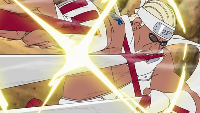 At the Land of Lightning they go up against Killer Bee, whose attack utilising Lightning Style and seven blades proves to be more than a match for them.