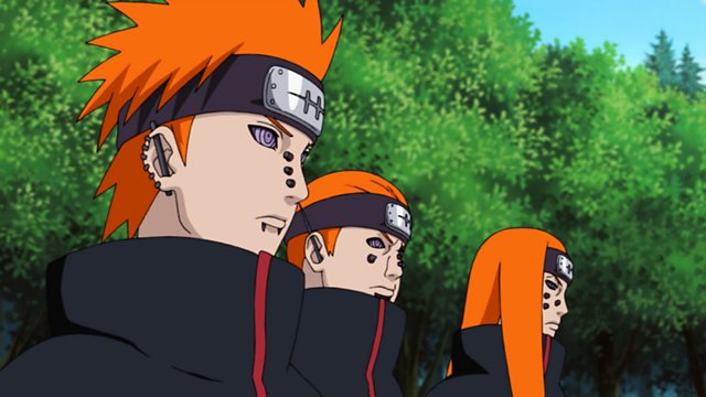 Shikamaru and the others wait for the information Jiraiya brought back to be analyzed. The Hidden Leaf ninja continue their data analysis, when disaster strikes the village, the Six Paths of Pain have broken the Leaf’s defensive barrier to begin their assault in broad daylight. The invasion takes the people by surprise, and chaos breaks out in the village. The Leaf ninja fight back, but Pain’s attack proves to be all too powerful. Meanwhile, on Mount Myoboku, Fukasaku explains to Naruto the serious risks of the seemingly invincible Sage Mode.
