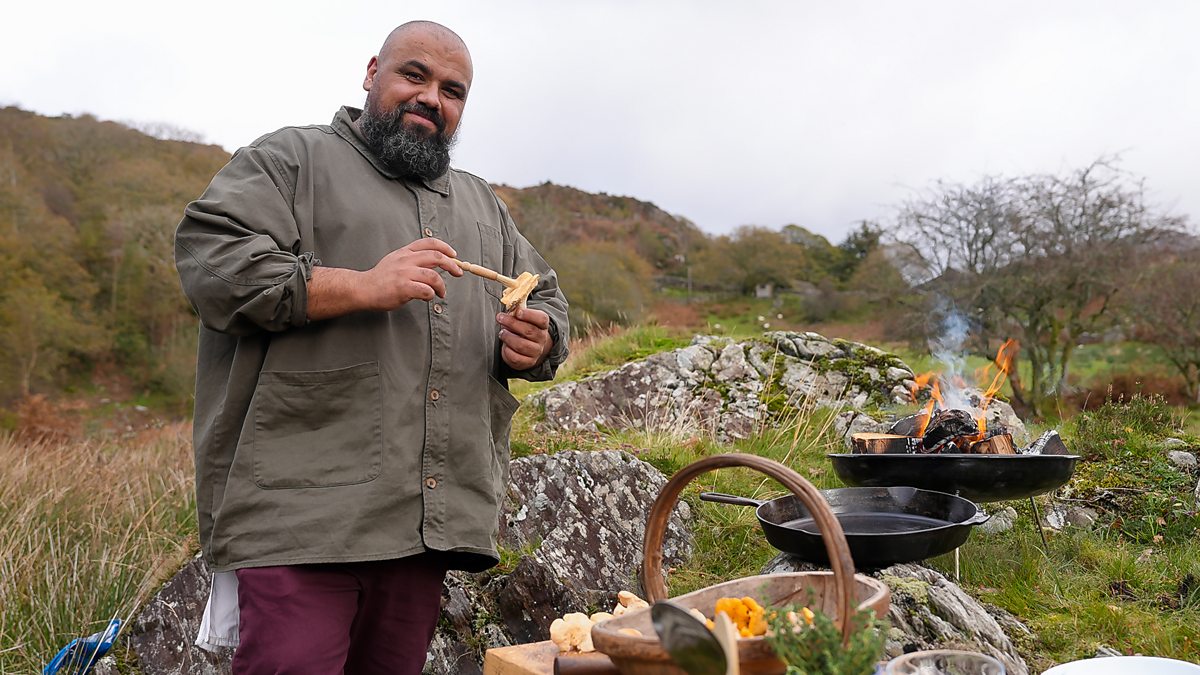 Next, Chris ventures into the woods with his food hero Cynan, a master mushroom forager. Together they search for chanterelles, hedgehog fungus, and other hidden woodland treasures. To thank Cynan, Chris cooks a forest-inspired dish over an open fire, finishing it with a rich, oozy egg yolk.