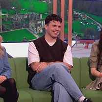 Lucy Beaumont, Harry Clark and Holly Humberstone join Lauren and JB on the sofa.