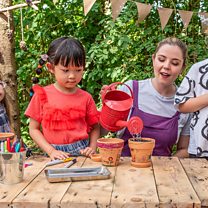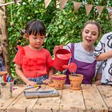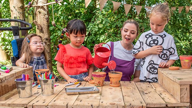 Lisa and the children plant sunflower seeds in decorated pots to grow beautiful flowers, learn British Sign Language signs for garden, grow and pretty, then sing and sign Mary, Mary, Quite Contrary.