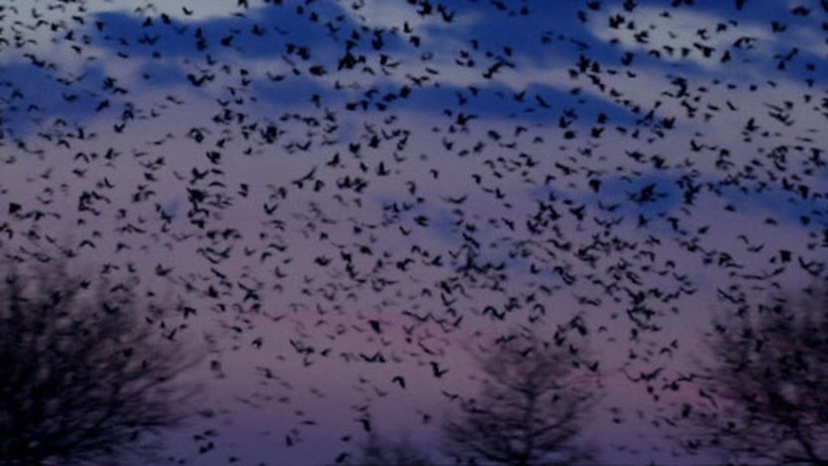 A mass of black birds gather on farmland with spectacular results.