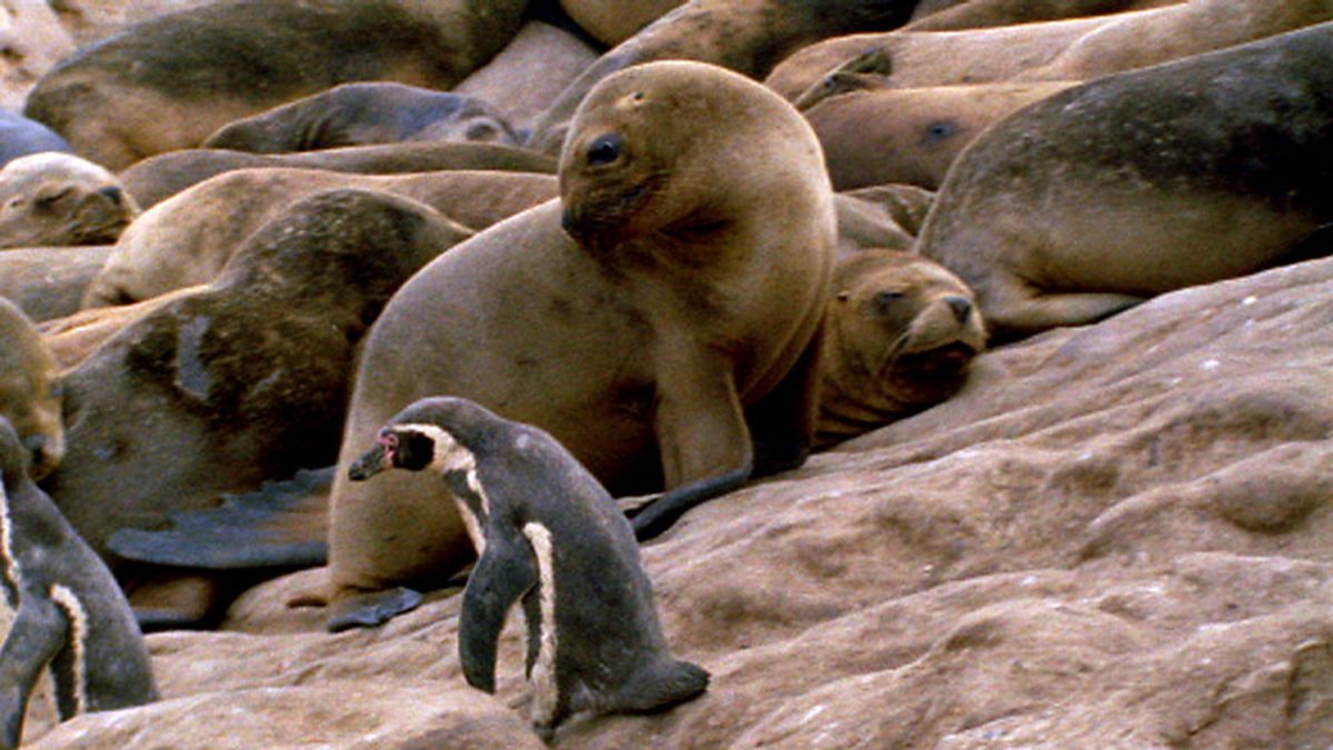 Humboldt penguins take full advantage of the rich fishing opportunities just offshore, but getting to the sea can be quite a challenge. The penguins need to cross a beach covered in potential predators. However, the well-fed sealions are so full of fish that the penguins are more likely to get squashed on the journey rather than eaten.