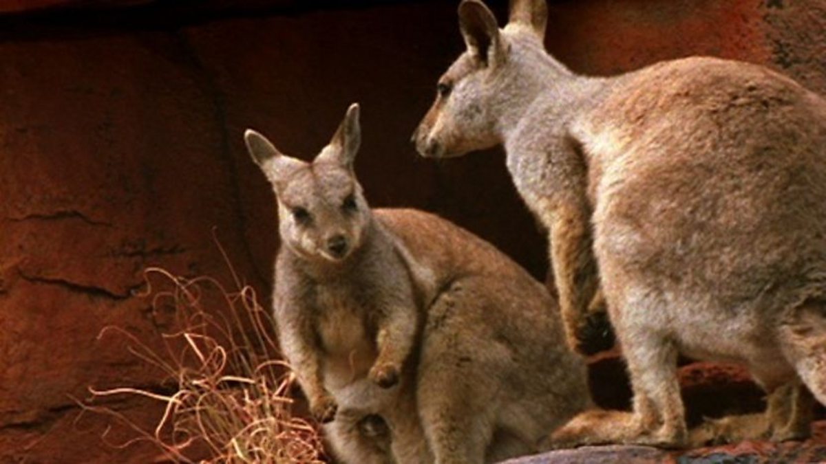 Black-flanked rock wallabies, also known as black-footed rock wallabies, aren't usually around in the day, but this is the breeding season and life is getting a bit frenetic. Males chase females around the rock face in an attempt to mate with them.