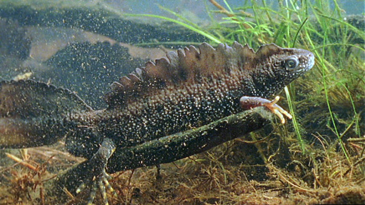 For great crested newts, mating is triggered by the spring rise in water temperature. The male fans his impressive, coloured tail and wafts pheremone scents over the female who finally accepts his advances. The female then lays her eggs on the underside of a leaf. In time, these will hatch into newt tadpoles.