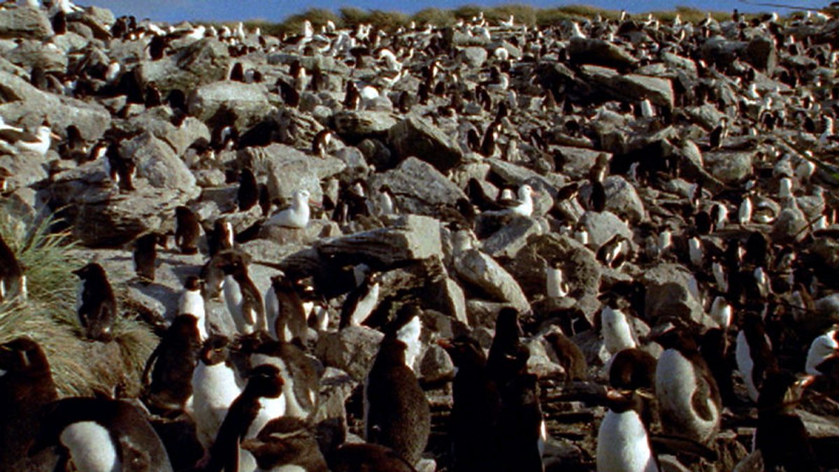 Three hundred thousand pairs of rockhoppers breed on the Falklands, almost two thirds of the world population. With good breeding sites so scarce in the Southern Ocean, they jostle for space with all sorts of other seabirds... like black-browed albatrosses.