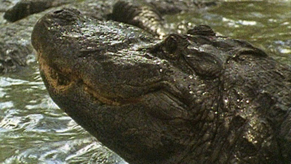 David Attenborough talks about the extinction of the dinosaurs and creatures that survived that event, such as alligators and birds. Possibly the feathers of the earliest birds helped them survive climate change. Footage of egrets and herons in the swamp. An alligator dives into a pool.