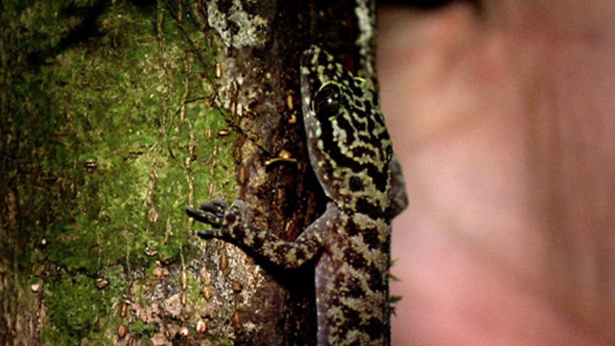 Just a stone's throw from the scientists' camp, a new species of gecko is found. Eggs seen through its transparent underbelly identify that it's a female, though the species is unknown. Banded tail markings camouflage it effectively against a tree.