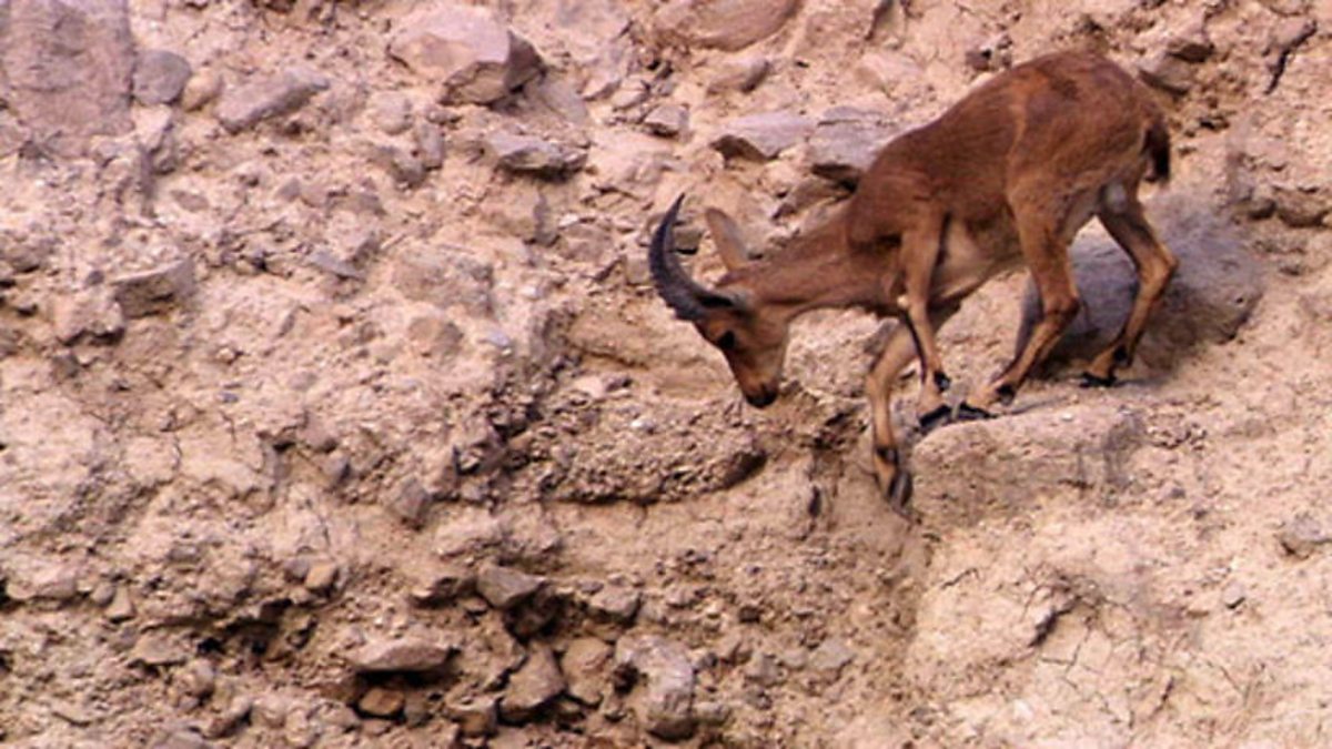 High up on steep cliffs, ibex give birth to their young. The kids are protected for the first few days, isolated on the clifftop, but to reach the only food and water in the area they must descend into the gorge, and the domain of their enemies. The adults begin to descend, leading the way as they know the safest routes. But safe is a distinctly relative term on these precipitous slopes - every step looks like it could end in a slide to the death. The kids must follow and keep close by. Cloven hooves that spread under load, astonishing balance and the most uncanny agility are their only assets and help the youngsters keep their footing. Barely a week old they are utterly fearless and learning to negotiate the cliffs is essential to their survival. At the bottom, the family must be on guard against predators as they grab the chance to browse. Trailing behind is a straggler and lying in wait is a fox. The fox leaps from cover and chases the young kid back up the slope. Instinct forces the kid upwards, until it finds a safe, tiny ledge on one of the steepest parts of the cliff. Only an ibex could reach and stand here, the fox just can't get to it and the kid has learned a valuable lesson.