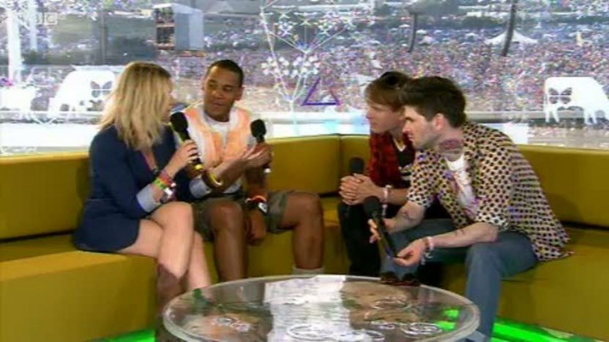 Edith Bowman and Reggie Yates interview Franz Ferdinand at the Glastonbury Festival.