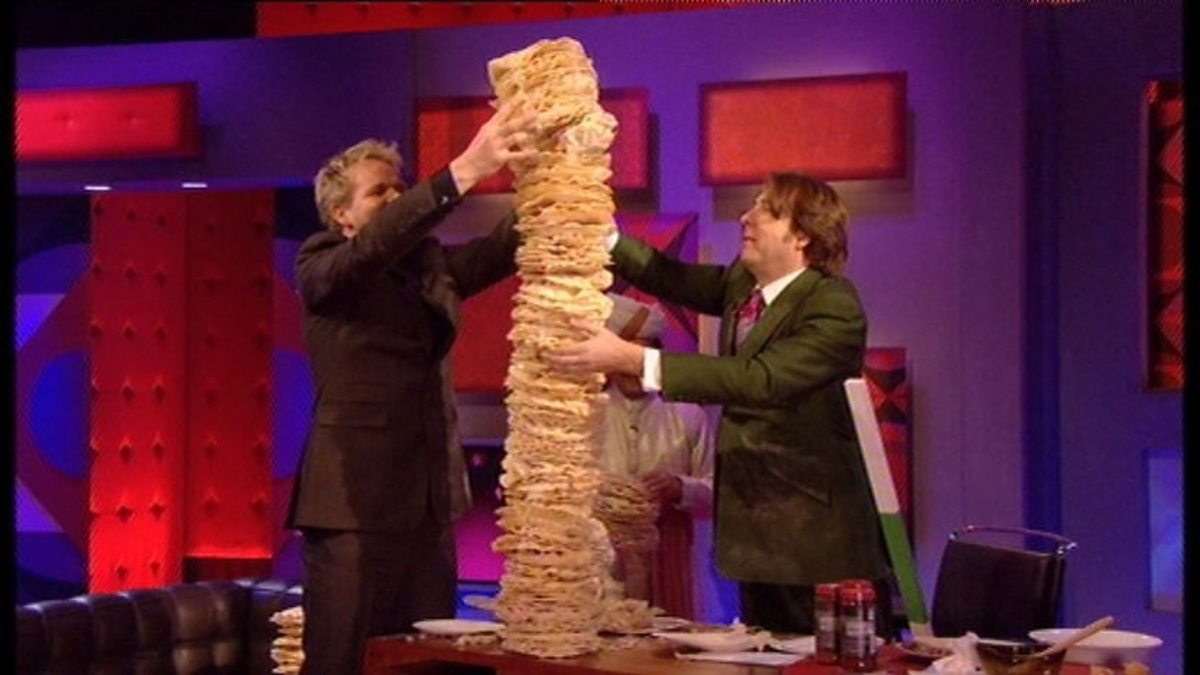 Jonathan Ross & Gordon Ramsay try to build a tower built of poppadoms. Jonathan uses his old mobile to call up the order.