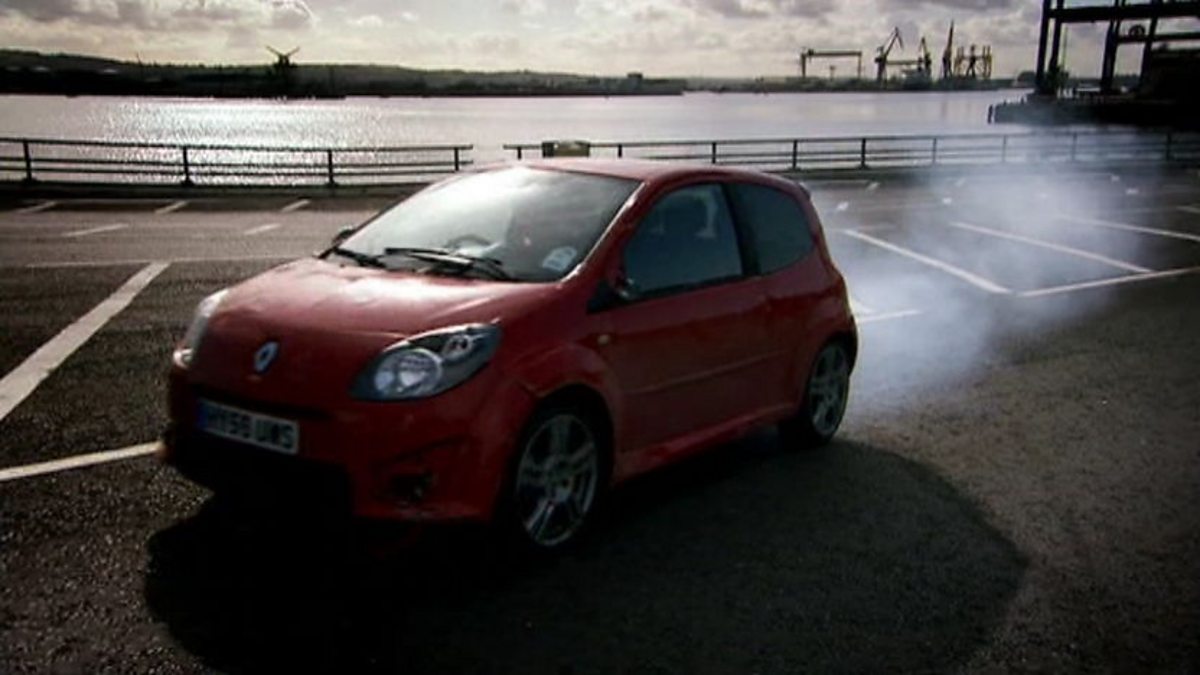 Jeremy Clarkson in a Renaultsport Twingo 133 races through the ferry port to catch a ferry back to England. Ross Kemp seemes to be wedged in the back seat.