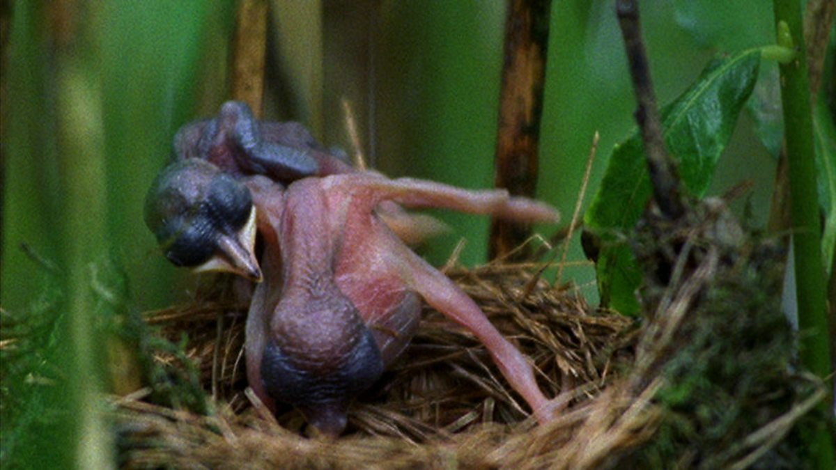 Although blind, a newly hatched cuckoo chick is far from helpless - it's strong enough to push a reed warbler chick out of the nest which it does unceremoniously. Clearly straining the chick drags and pushes its rival to the edge and hauls it over where it falls into the marshy water below.