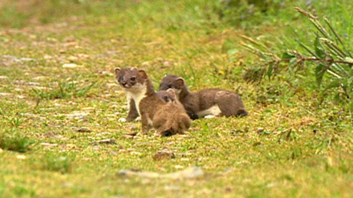 Cameraman Mark Yates got a great chance to film the local family of stoats on the Pensthorpe reserve during 2009's Springwatch. The mother stoat has obviously taken full advantage of a nearby rabbit warren providing a larder full of food for what turns out to be a huge family. Nine kits in total are moved from their den to a new home across the road, followed quickly by the food their mother has been stockpiling.