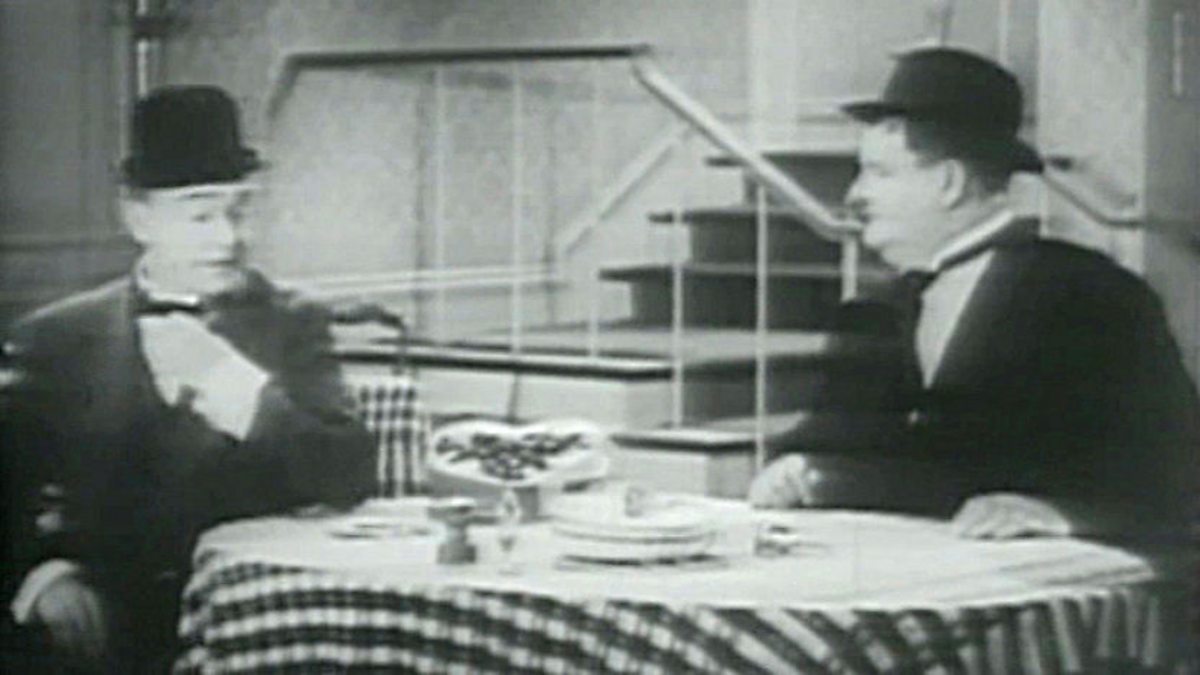The Story of Slapstick charts the history of the world's most popular comedy genre. Whether you're three or fifty three we all seem to love physical humour. It doesn't matter if they're slapped, banged or walloped, there's a simple glee in the misfortune of others. In this short clip we see the most famous double act in the world relaxing for a drink and a bite. Laurel and Hardy were a penniless pair of dunderheads always struggling to make a buck. The simple power play in their relationship provided laughs for years.