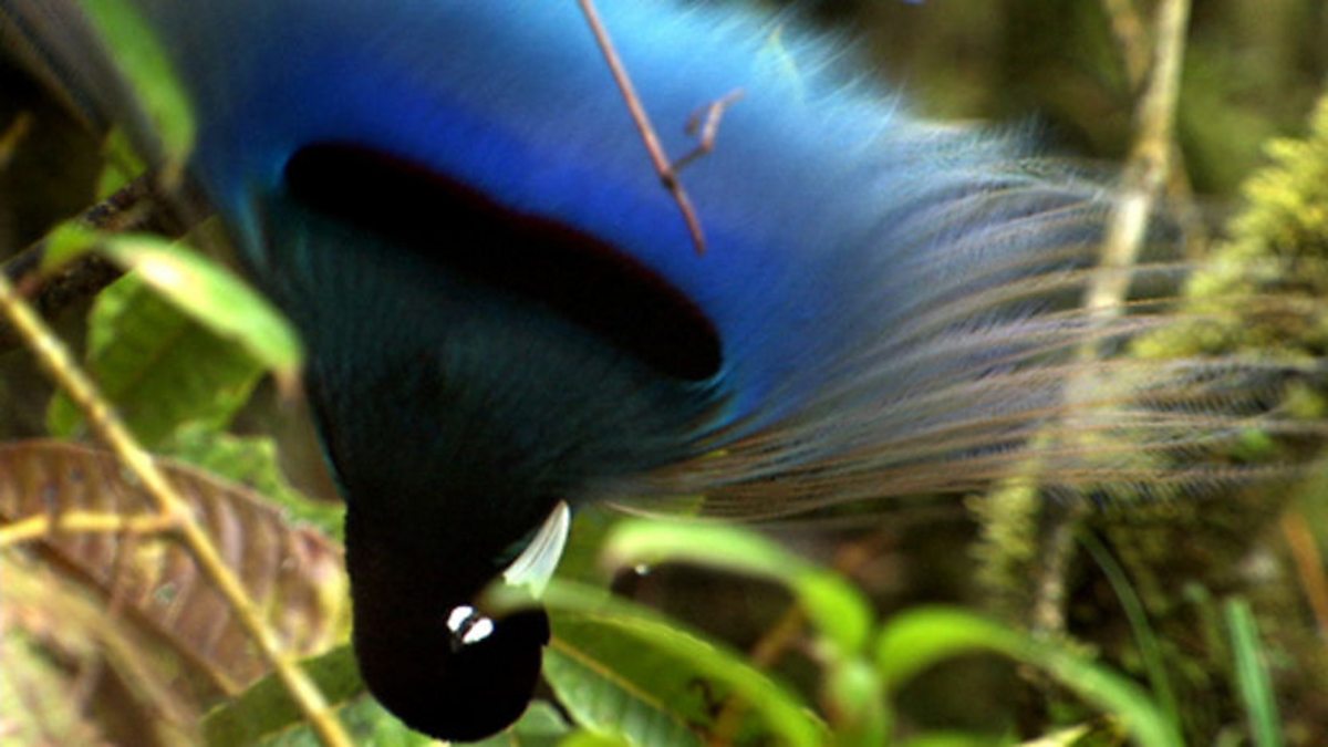 A male blue bird of paradise returns to his favourite branch and begins his unusual display. He stops briefly as a female comes down to take an interest in his dance, and with renewed vigour he begins his display again. The pulsing of his body and feathers changes to a subtle low buzzing. This unearthly sound is only made when a female is present and is unlike anything found elsewhere in the bird world. Moving closer without actually touching him, the female seems to study every feather of his vibrating body, but she seems unhappy with something and flies away. It is an unfortunate end to his beautiful display after so much effort.