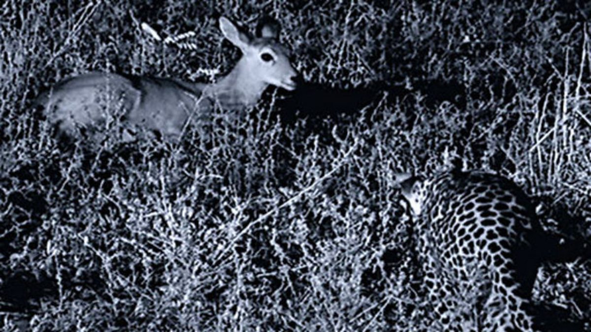 As night falls, a female leopard uses the darkness as her cover as she begins to hunt. Her concentration on the prey ahead is total, even a moth trying to drink moisture from her eye doesn't break her focus. But the ever vigilant impala are too alert and jump away in the nick of time as she approaches. Wildebeest calves are less vigilant and the night offers all the help she needs. In a flash, with relatively little effort, she quickly catches a young calf and stashes her prize up a nearby tree, as the stampeding herds will quickly attract the attention of lions and hyenas. Sure enough, a lioness finds her and starts to climb. Lions are too heavy and cumbersome to be good climbers, and she's soon distracted by activity elsewhere. The leopard's meal is safe.