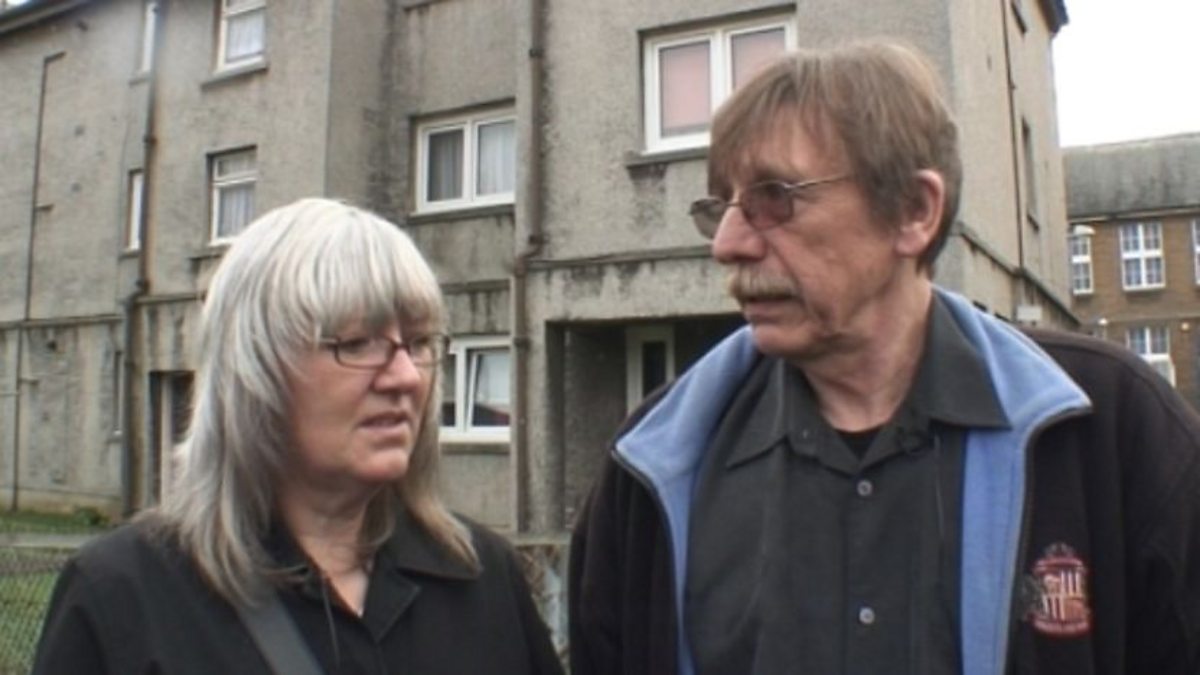 Robert and Jeanette Veitch are at the rear side of 35 Loaning road. Roberts explains the damage caused by the bomb.