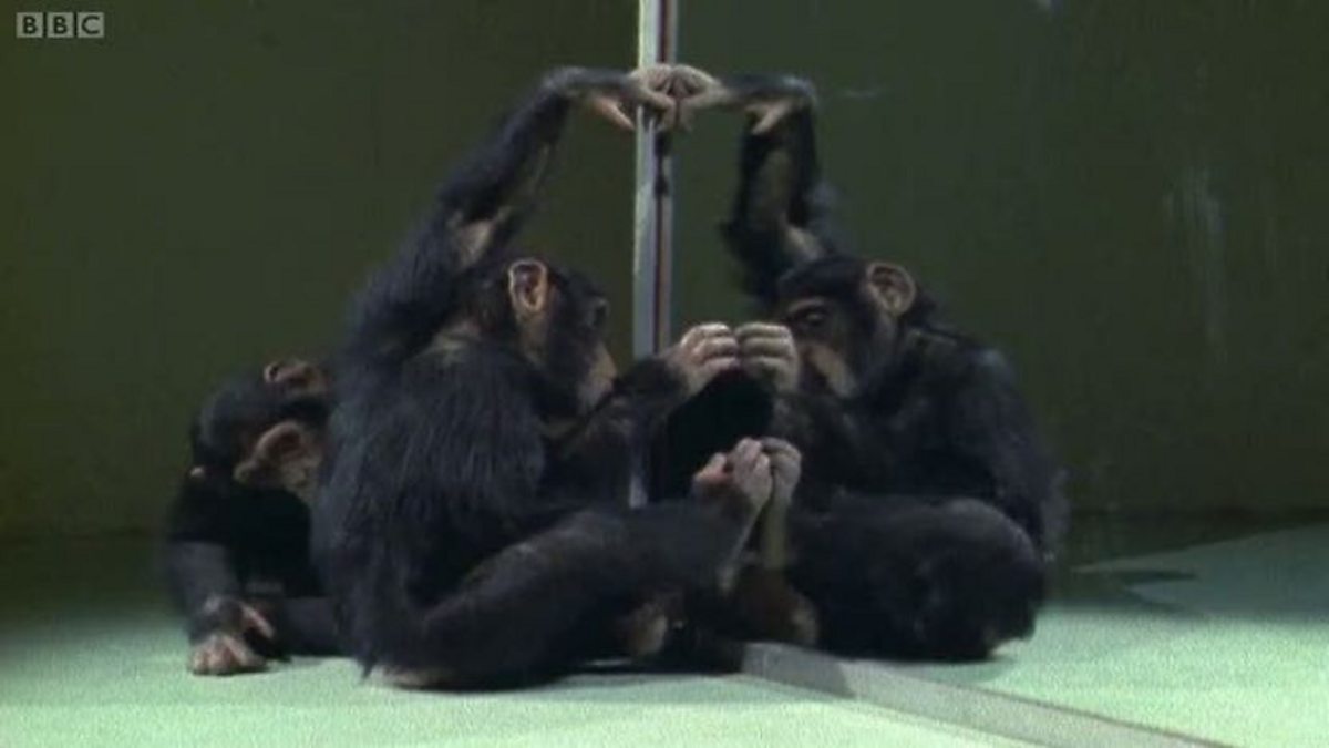 Can you imagine what it would be like if you have never seen a mirror before - to see your reflection for the very first time? In some chimpanzee colonies, researchers have provided mirrors to allow chimps to get up close and personal with themselves. The chimps' first reactions are usually social in nature, so you might see a little bit of aggression as they get used to this new chimp, or sometimes even a little bit of play. Eventually the chimps start to test the relationship between what they are doing and what they are seeing, realising that the other chimp is doing exactly the same thing. These are the first signs that they're understanding it's their movements that are making these reflections happen. They then begin to explore parts of their bodies they have never seen before, inside their mouth and their eyes, looking at their teeth. The reason these chimps are able to do all this, is because they - like us - have a sense of self.