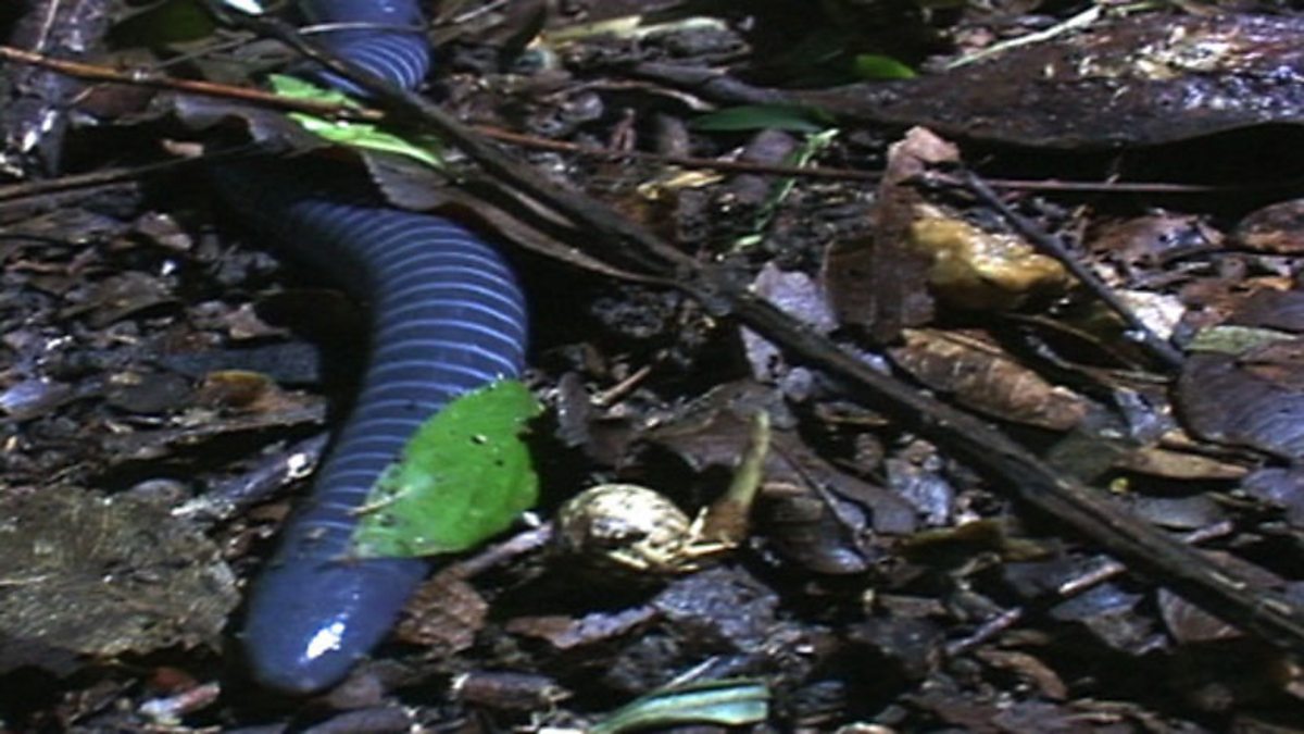 Salamanders have small legs, but caecilians have lost them altogether. Legs would be in the way for burrowing. They look rather like earthworms. Every rainforest has caecilians hiding in the leaf litter. A mother caecilian and her litter of young are in an underground den. The baby caecilians feed on their mother's secretions, but they have teeth and every now and then go into a frenzy and rip at her skin. She has made a special fat-rich skin for them to eat and regrows it every three days.