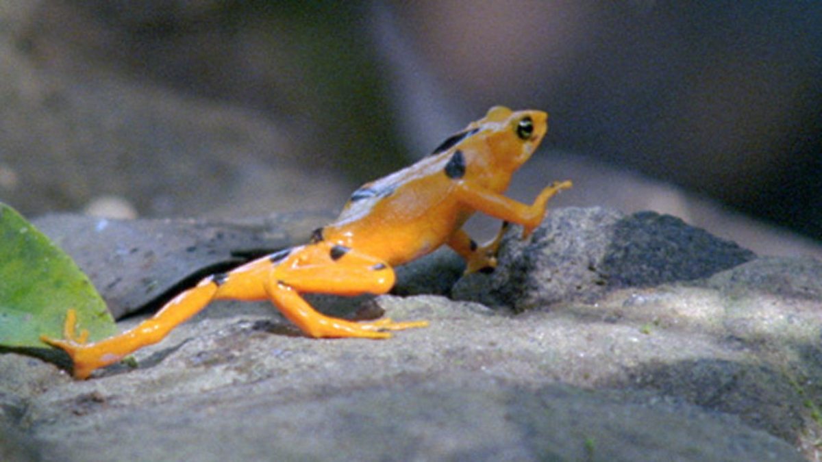 In a rainforest stream in Panama, the sound of the running water can drown out the territorial calls of frogs, so the rare golden frog has a novel way of getting around the problem. Males set up their territory by the river and then wait for females to turn up, but since good territories are hard to come by the males may have to hold them against intruders. And the way that rivals signal their presence to each other is by waving at each other with their front legs. If the male intruder is not deterred by the waving but simply waves back then there will be a confrontation. When a large female arrives - without the male's black markings - the male clambers on to her, ready to mate. But while he is occupied, another challenger arrives and also jumps on her and the female hops away with both males on board. Most frogs find safety in camouflage, but golden frogs are easily seen. The poison in their skin means they can afford to be conspicuous as predators know to avoid them.