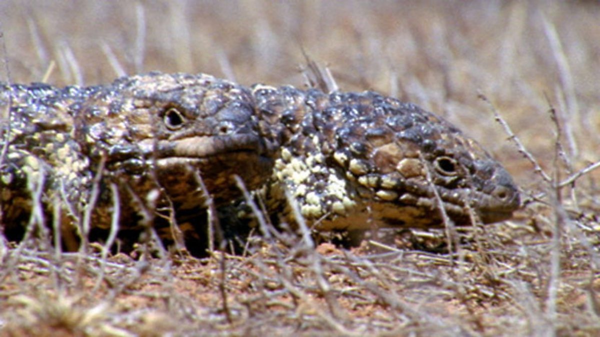 In the outback of South Australia, David Attenborough sits by a shingleback skink, also known as a sleepy lizard. It’s quite a baffling creature because its head and its tail look very similar. But when David brings its hand close to it, it immediately opens its mouth and threatens him with a gape display. When the female catches the eye of a male, the male starts to follow her wherever she goes for up to two months, courting her by gently nudging and licking her. Six months later the female gives birth. It is a long and strenuous business as she does not lay eggs like most lizards but gives birth to two large live young which - together - weigh a third as much as the mother - the equivalent of a woman giving birth to a three-year-old child. Producing such well-developed young is the shingleback's response to the fact that it can get quite cold in south Australia. So, like the Cape chameleon in South Africa, the female acts as a mobile incubator, seeking out the warmest locations in which to bask. Her young are so advanced when they are born that they soon leave home, but when spring returns the same male and female will seek each other out and mate again. In fact, they may remain faithful for as long as twenty years or more. And the bond between them may even endure after death. If one is killed on the roads, the other will stay by its body for days, gently nudging it in apparent grief.