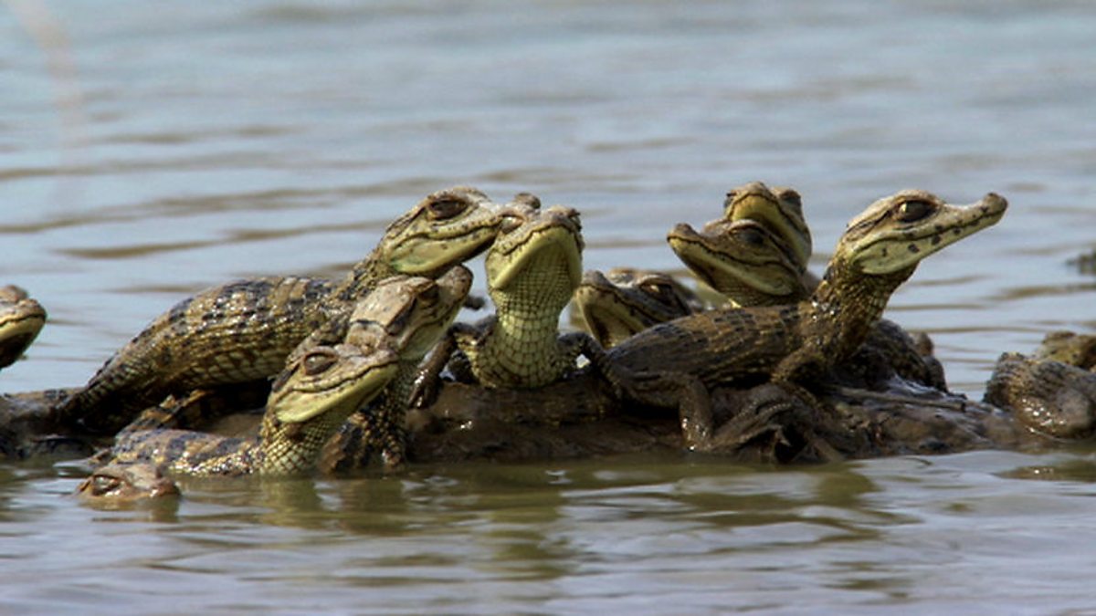 The llanos of Venezuela is a lush wetland teeming with wildlife of all kinds. As well as birds, there are capybara and spectacled caiman. One female caiman is in a pool looking after an extraordinarily large number of babies, most of whom aren't actually hers. However, keeping an eye on all these babies is not easy as there are lots of enemies around, like the white egret. Seeing one of these birds on the bank, the babies all run to the female, even though she may not be their mother. In fact, there are so many of them that there is not enough room for them all on her back. But soon the water which keeps them safe will begin to dry up. Each year the llanos is transformed into a baking oven that can be too much for some of the babies, some of whom will die and become food for the local egrets. To save the rest of the babies, the female leads the cavalcade of babies across the dried-out plains in search of permanent water, calling out to them all the time, and listening for their responses. If they are slow she waits for them to catch up. Without this level of care and attention, few of the babies would survive. We may call reptiles cold-blooded, but they can show great tenderness.