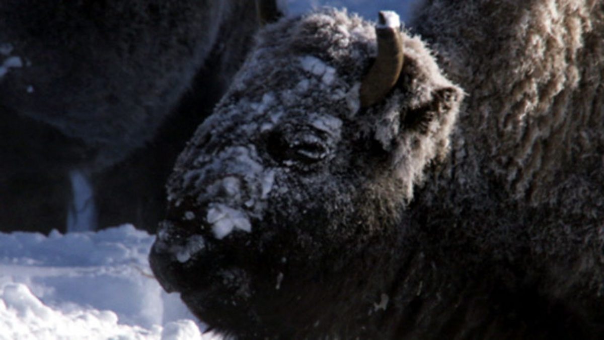 On the open plateau in the middle of a frozen volcano in Yellowstone is an animal that has lived here since the last ice age. Bison are built for the worst of the Yellowstone winter. Their thick coat is so well insulated they only need a tiny bit of energy to keep warm. So they slow their metabolism right down and concentrate on feeding. With their massive neck muscles, they sweep their heads down through the snow to get at the grass below. But the winter grass has long since put its summer goodness down into its roots and now has about the same nutritional value as cardboard. The bison will need to do all they can to save energy if they are to ward off starvation until spring returns.