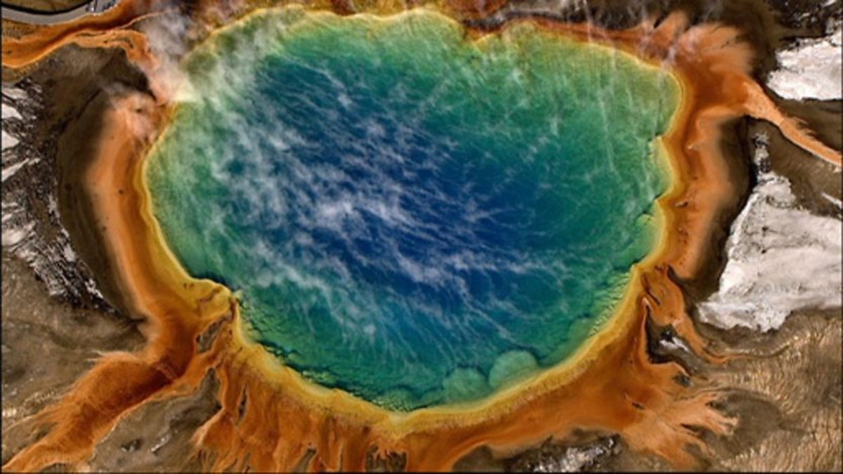 The temperature is a constant near-boiling in Yellowstone's thermal springs, yet incredibly, huge colonies of heat-tolerant microbes thrive here. As the boiling water flows out from the central spring it cools, forming bands of different temperatures, each with a different collection of microbes with a totally different colour. Grand Prismatic Spring is one of the wonders of the natural world. It's thought that it was in conditions like this that life on Earth first started.