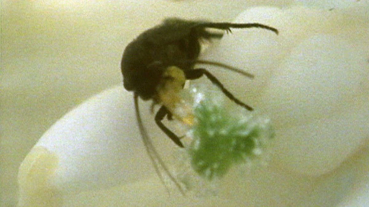 This time she is more interested in the ovaries at the centre of the flowers. She will then spend around 20 minutes using her egg-laying tube to lay her eggs in the base of the flower's ovary.