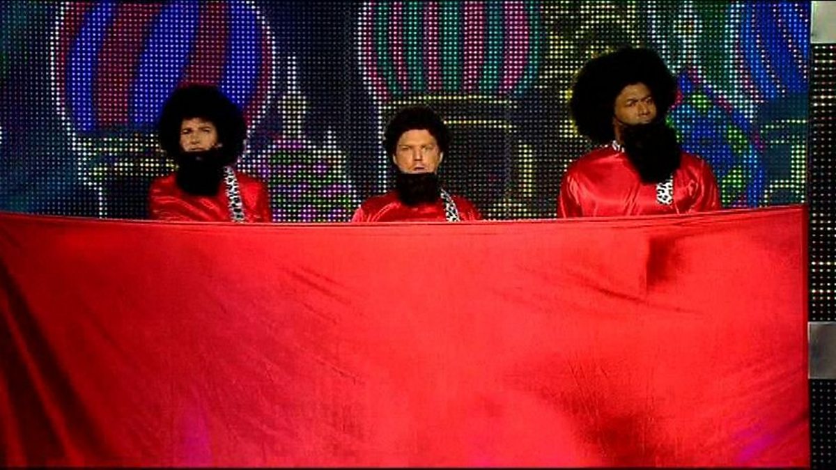 Bellamy's People acors Felix Dexter Lucy Montgomery and Rhys Thomas strut their stuff performing Boney M's Rasputin for Sport Relief.