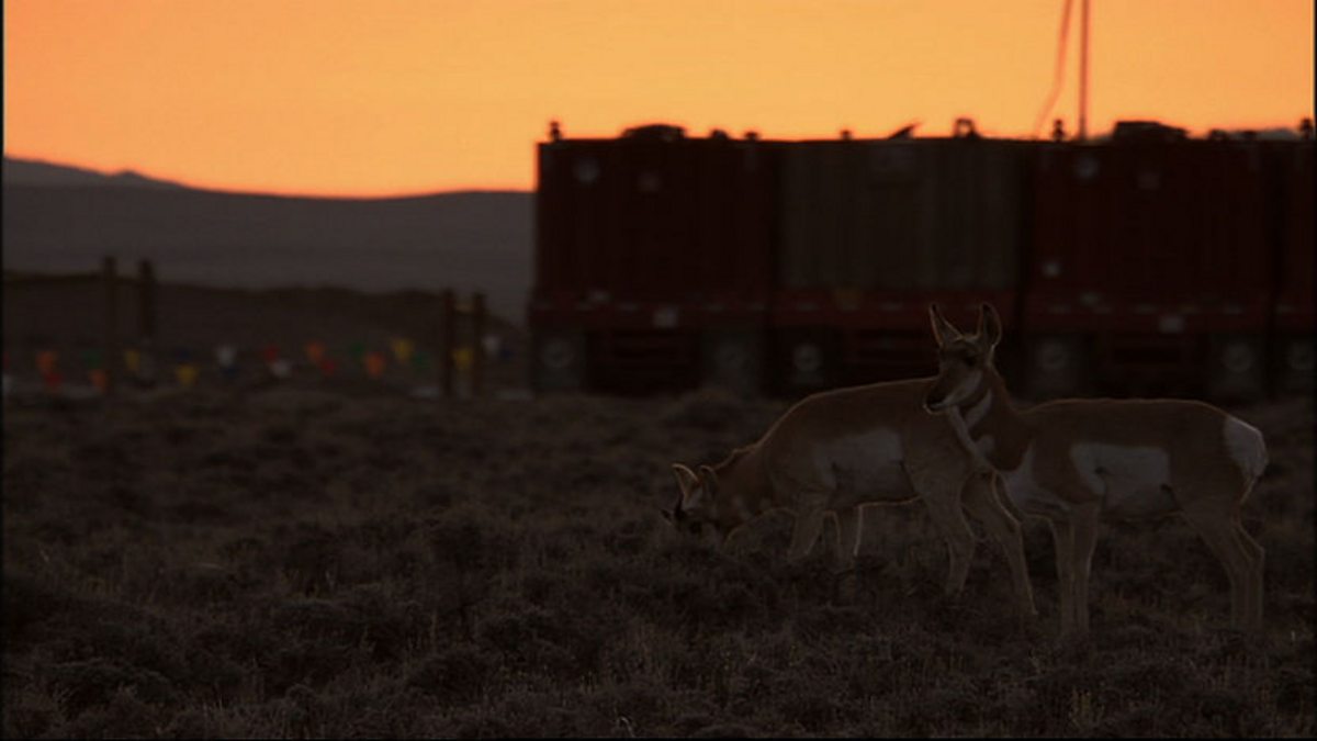 Migrating pronghorn push further out of the forests of Yellowstone than any other of its inhabitants, through farmland and down into the wide prairies at the foot of the rocky mountains themselves. Their search for winter grazing takes them over a hundred miles to the south of Yellowstone - the longest migration of any American mammal. They have made this journey every year since the last ice age. But nowadays they have a problem. Their traditional winter refuges lie right above some of the richest natural gas deposits in America. The wells are no direct threat to pronghorn. But pronghorn are timid. At the slightest noise they run and when they run they run at 60 miles per hour. They evolved to avoid cheetahs, not juggernauts. Trucks, fences, and the disturbance from the wells have put pronghorn at risk as they cross the roads busy with industrial traffic. There are 1.2 million acres here, but 75% of it has now been earmarked for gas and oil.
