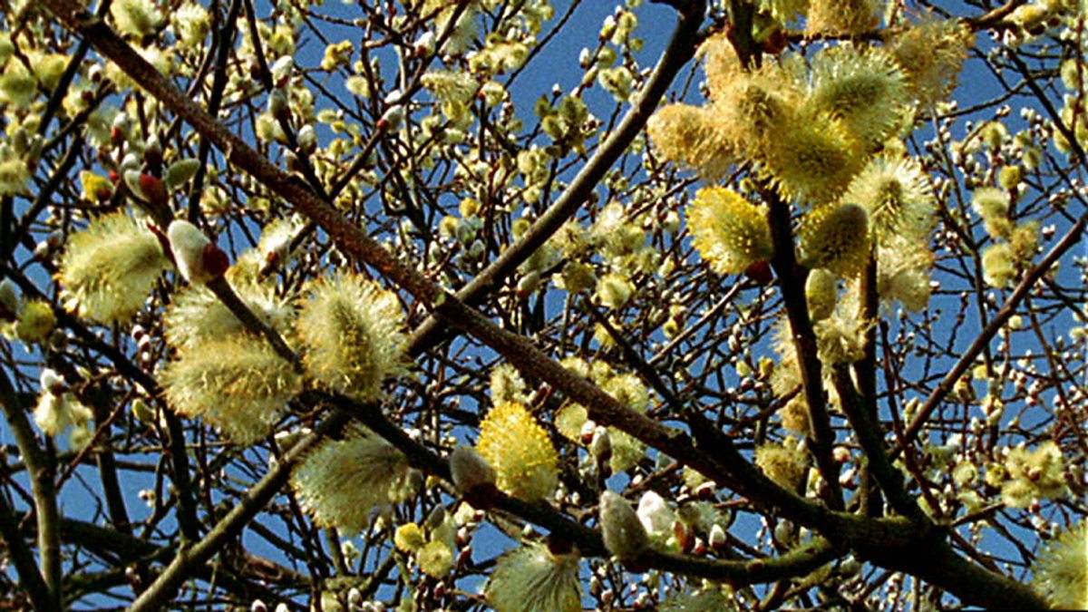 As the spring weather improves, the catkins of the pussy willow - or sallow tree - unfurl, and the male catkins turn yellow with ripe pollen. Insects just out of hibernation are attracted by the bright yellow colour and carry pollen between the male and female trees.