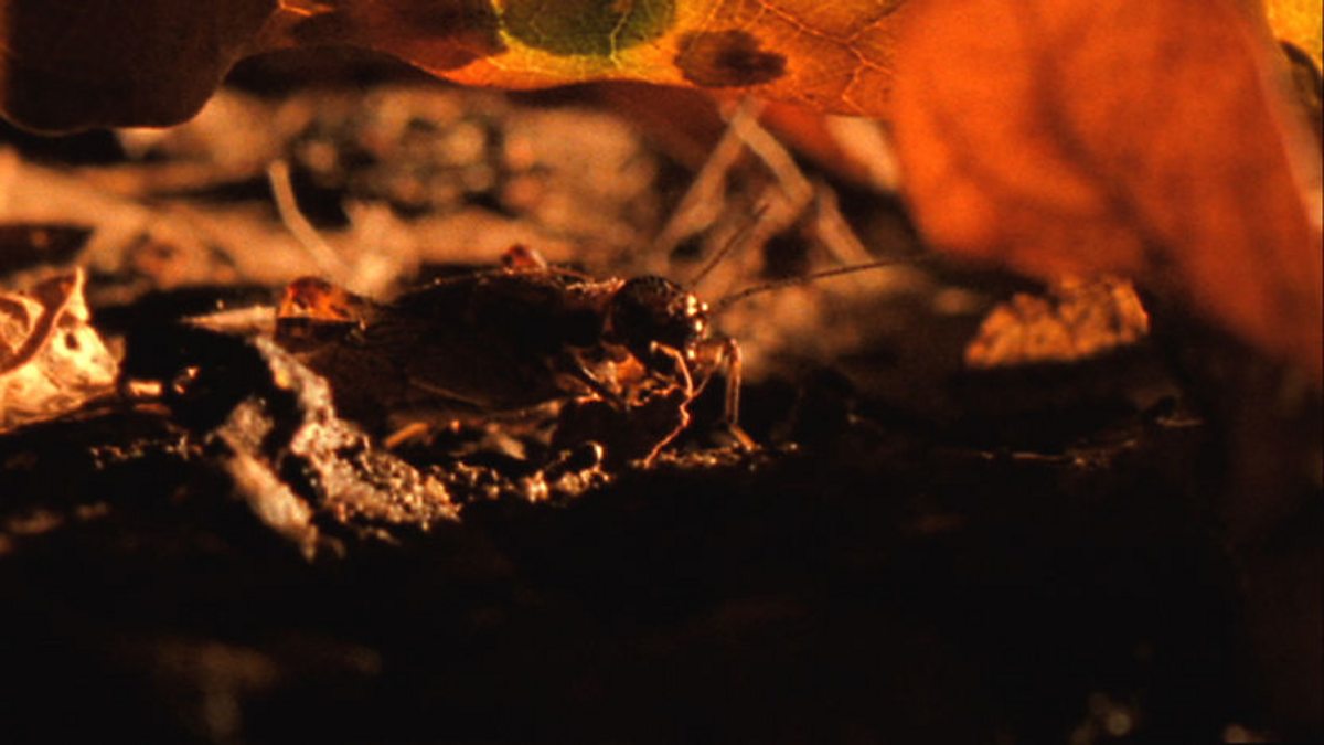 The fall of autumn leaves creates a blanket on the ground and provides a rich habitat for creepy-crawlies. Predatory millipedes crawl through the leaf litter hunting for prey, while wood crickets feed on the leaves and dead animals. Most of the leaf litter creatures die in their first winter. Only a few will survive until spring.