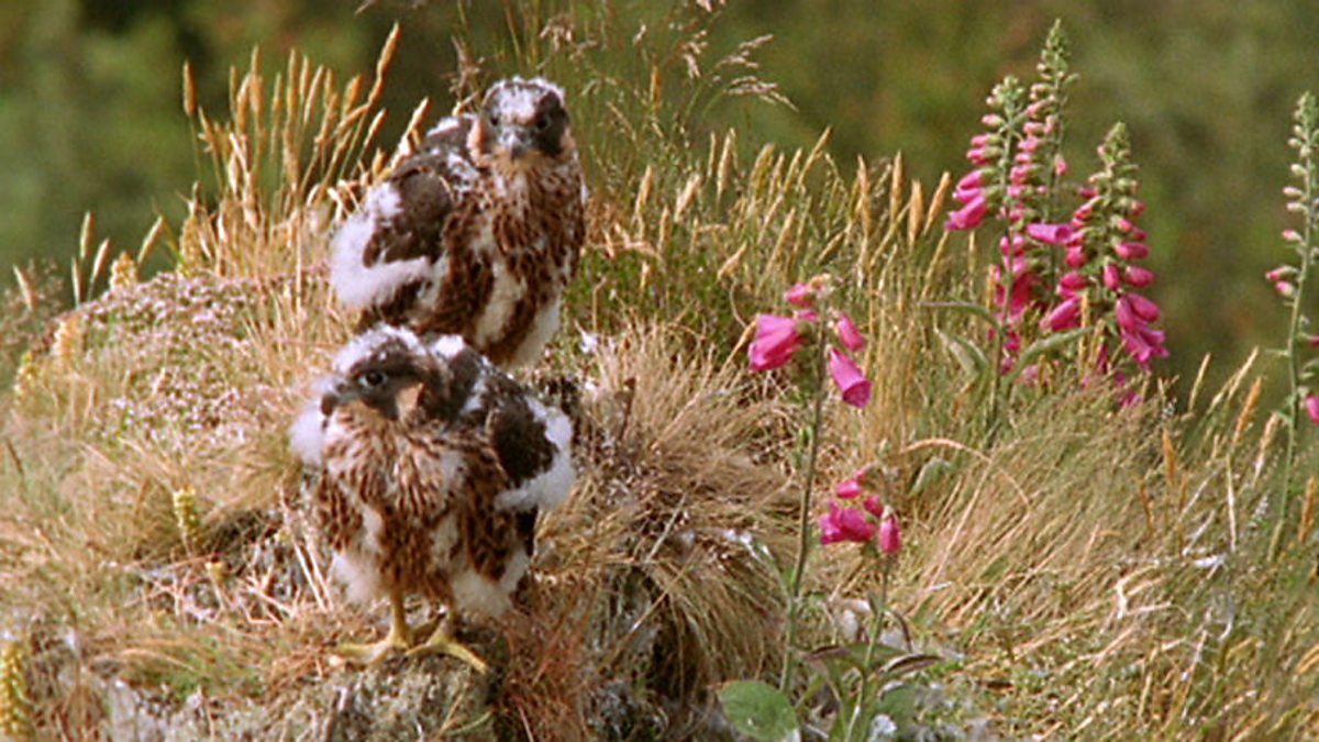 The view from Duncrine Hill is of the stunning Loch Lomond. Summer breezes from the south bring warmth to these lowland hills which are perfect peregrine country. Once persecuted, the peregrine is beginning to make a comeback across Britain. The three chicks pictured in the eyrie are all about 14 days old and have to be fed at least four times a day. The female does most of the feeding whilst the male does the hunting. In one month the youngsters will join their parents in the air.