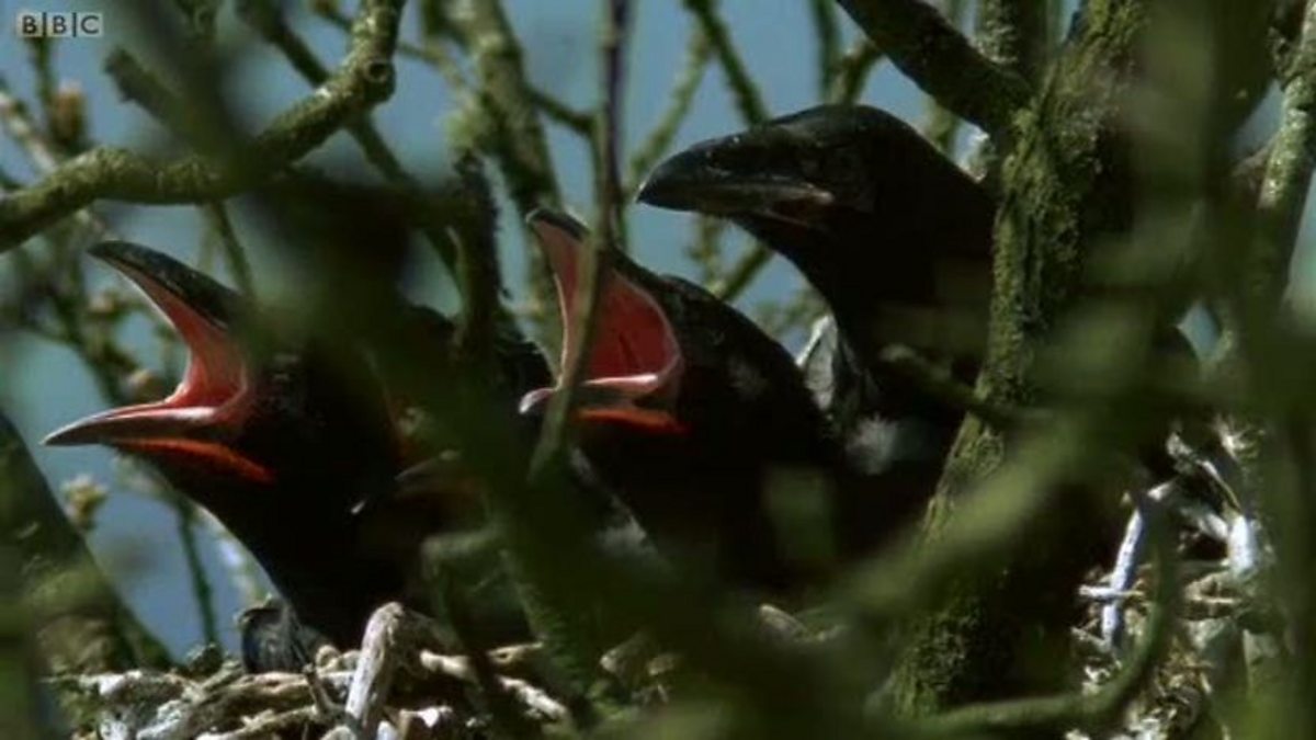 Undisturbed by people, a pair of ravens build their nest in an oak's upper branches. Ravens breed very early in the year, perhaps because they are scavengers and actually benefit from hard times. They mate for life and can live for over 20 years. The reason they need a faithful partnership is because a large brood of hungry babies would be far too much work for a single parent. And by mid-March their nest is full of exuberant chicks all demanding attention. The ravens' nest is huge as the parent birds have bred here for many years, adding on new layers every spring. But by early summer the ravens have gone.