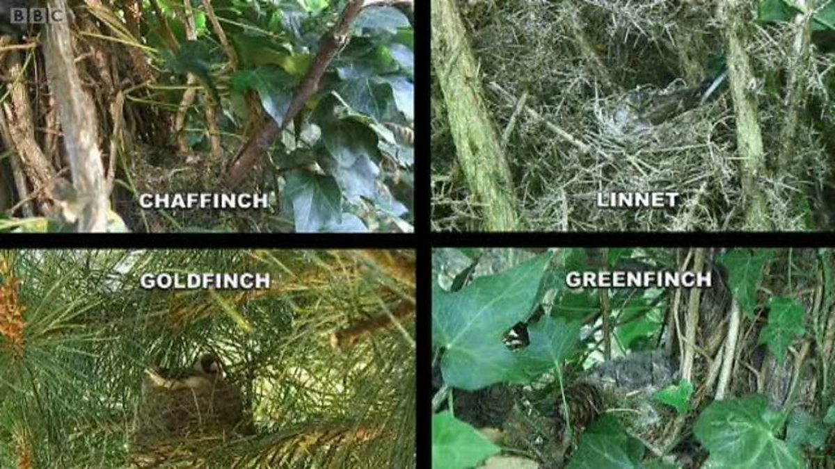 How do finches share out resources? Springwatch has been following chaffinches, linnets, greenfinches and goldfinches all of whom nest in different locations to share out space. The chaffinch normally nests right up against the trunk of the tree, about five metres up, camouflaging the nest with moss and lichen. The goldfinch nests about six metres up in the thinnest twigs as protection from predators. They also have to share the local food. Chaffinches mostly eat invertebrates at this time of year and feed on the ground a lot. Goldfinch and greenfinches feed their chicks on regurgitated seeds. The goldfinch has a fine pointed beak and takes very small seeds. The greenfinch takes larger seeds. The linnet also had a narrow beak, but it feeds on seeds from farmland weeds, which is one reason for its decline. Scientifically, this spacing out in the habitat is called niche separation. And it works - it's why we have so many species on Earth.
